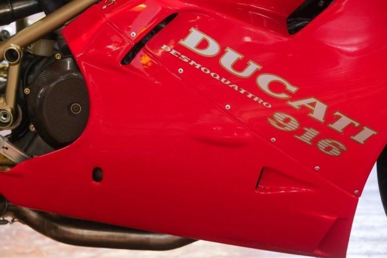 While the compression ratio was slightly reduced to 11.8:1 compared to the previous year, the bike still delivered an impressive 153 bhp at 11,000 rpm. Only 31 official customer race bikes were produced for the 1996 season. One of these, frame number ZDM916S007155, was acquired early in the year by the GSE Duckhams Ducati Racing Team for use in the British Superbike Championship (BSB) of the 96 season.