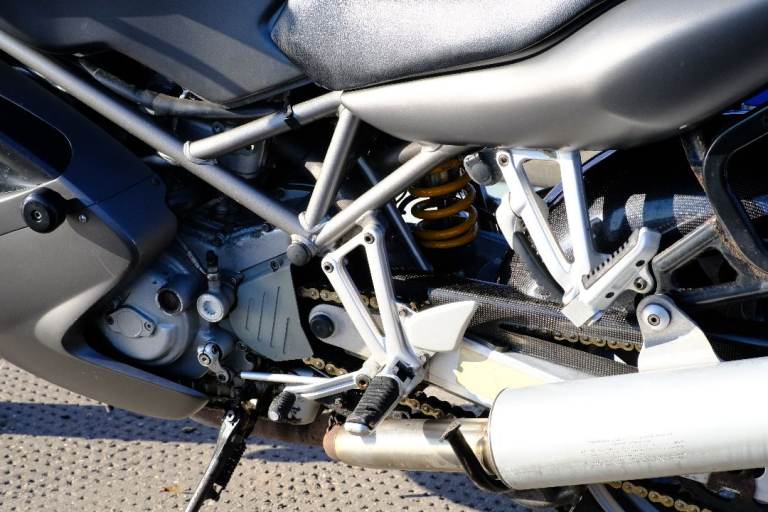 Engine from their superbike fitted, same with their fully adjustable front and rear suspension that is set up for comfortable but capable riding, and strong Brembo brakes.