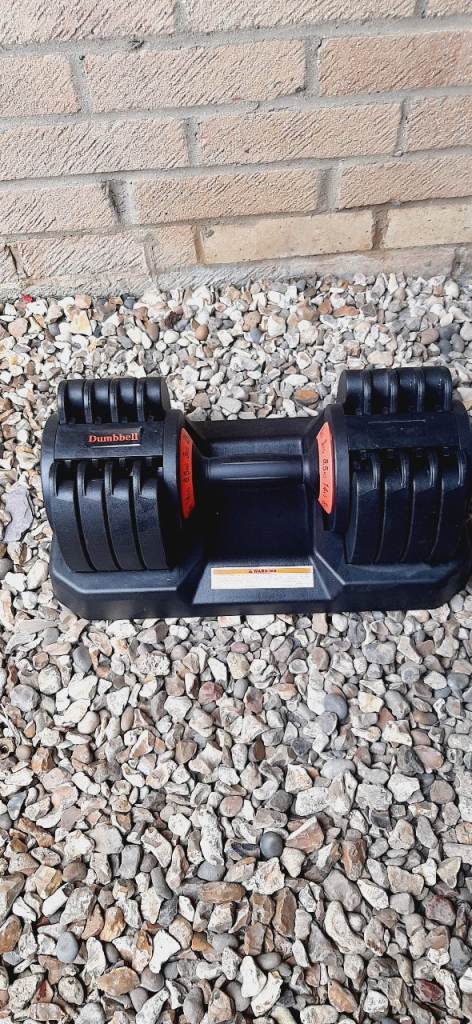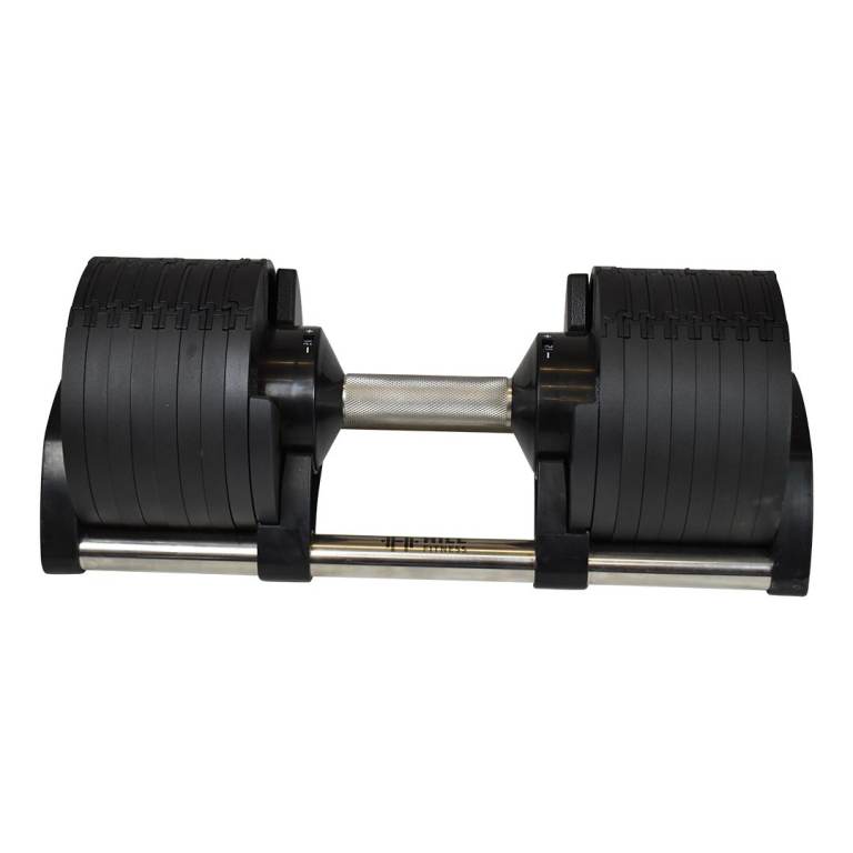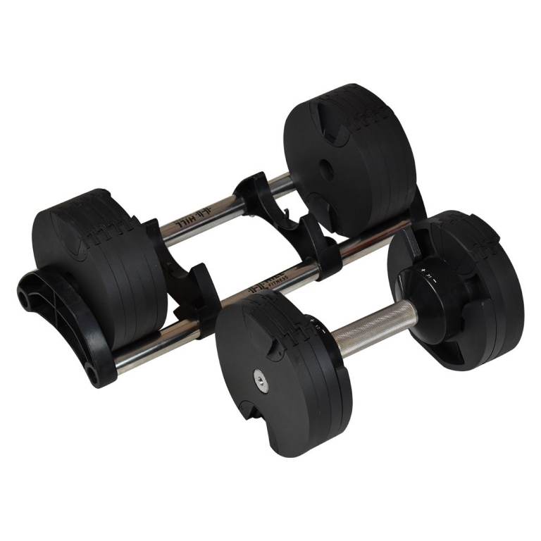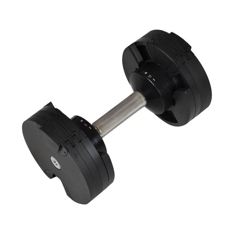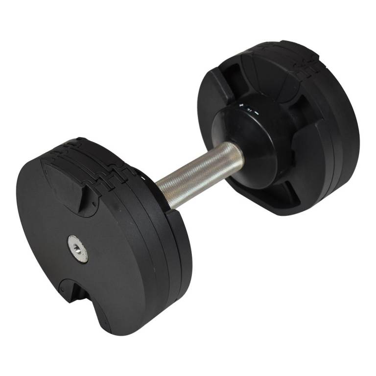 Adjustable weight system for weight exercises. A dumbbell that can be adjusted in different steps from 2 kg-32 kg. Made from a combination of steel and plastic.