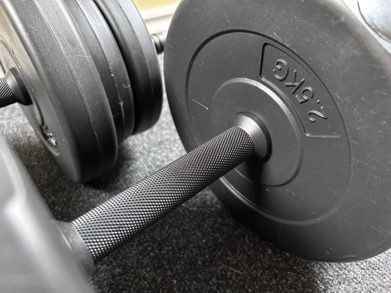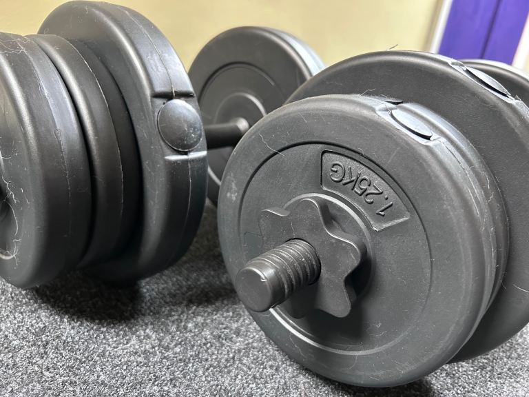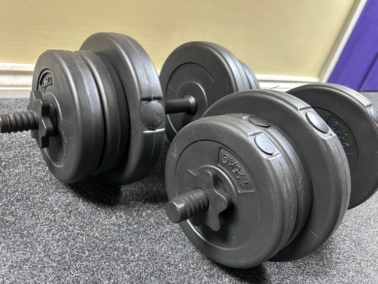 Comes with two bars, 4x 2.5kg plates and 8x 1.25kg plates