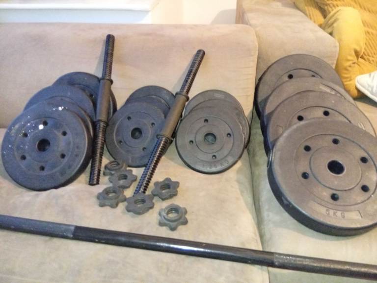 Set of dumbbells with one large handle bar and two small. Pick up in fishersgate. total weight is 37.5kg. there are 6x 1.25kg, 4x2.5kg, 4x5kg, two small handle bars and one big one.