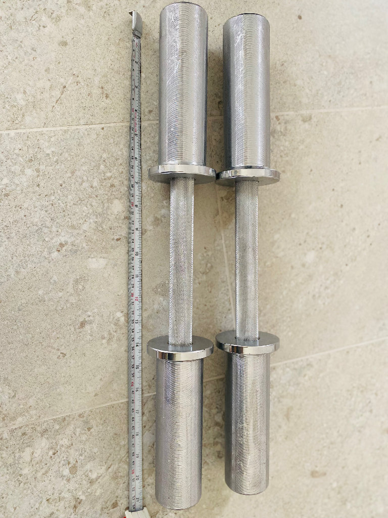 Plate-loaded dumbbells with 2-inch Olympic hole size. Each dumbbell weighs 3.5kg and comes with clips.
