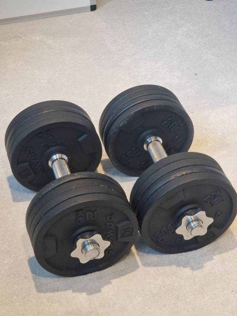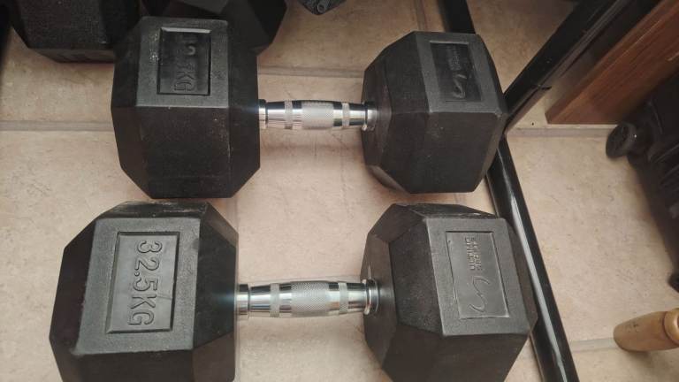 2x 32.5kg heavy-duty hex dumbbells in good condition.