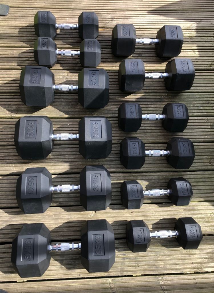 For sale 6 pairs rubber coated Hex Dumbbells Set which includes: 2x10kg,2x17.5kg,2x20kg,2x25kg,2x35kg,2x50kg-315kg total.Collection only and no offers please