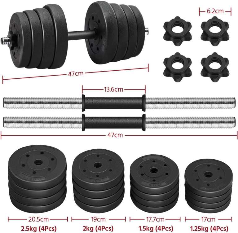 COMPLETE SET OF 2 Dumbbells - Our adjustable dumbbell set comes with 16 plates of 4 different weights (2.5kg, 2kg, 1.5kg, 1.25kg), 4 pieces for each weight; 2 iron bars measure 47 x 2.5 cm with a handle 13.7 cm long for each bar; finally, 2 collars at Star Star