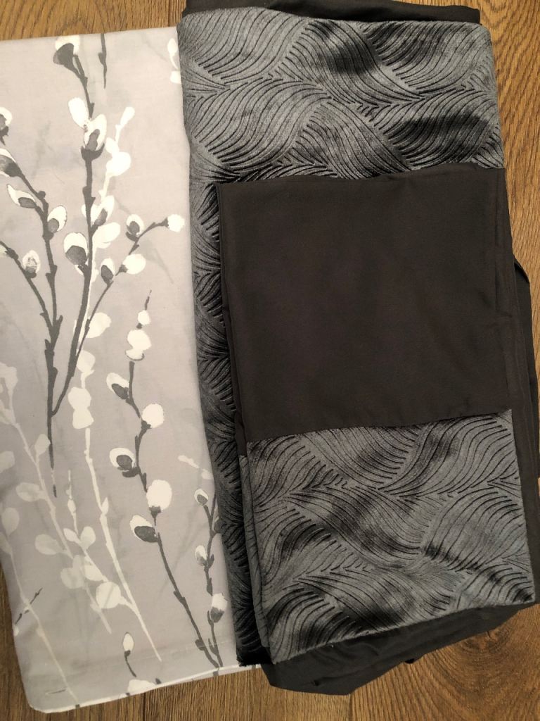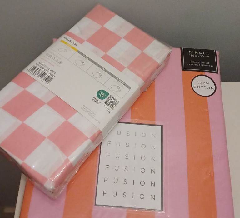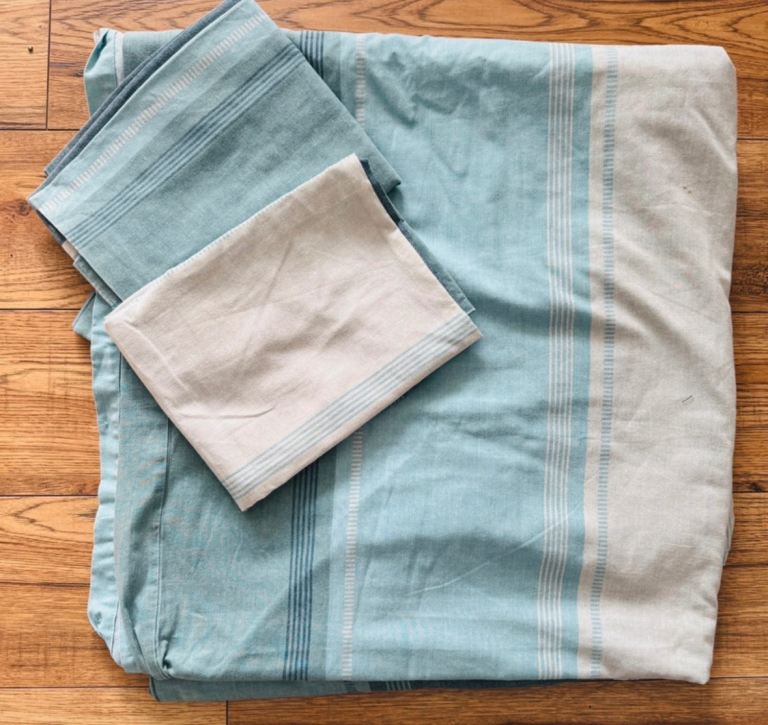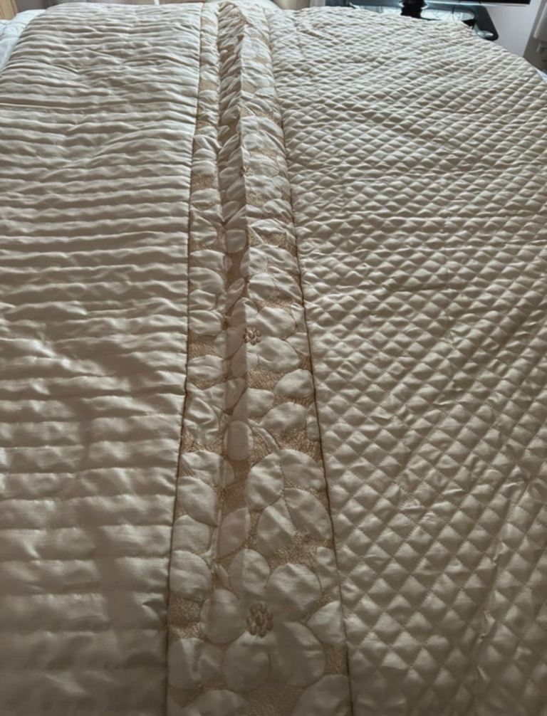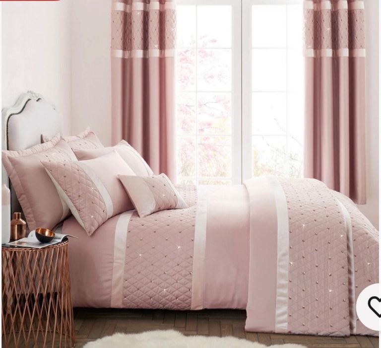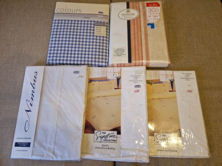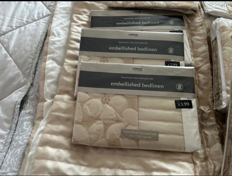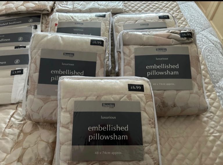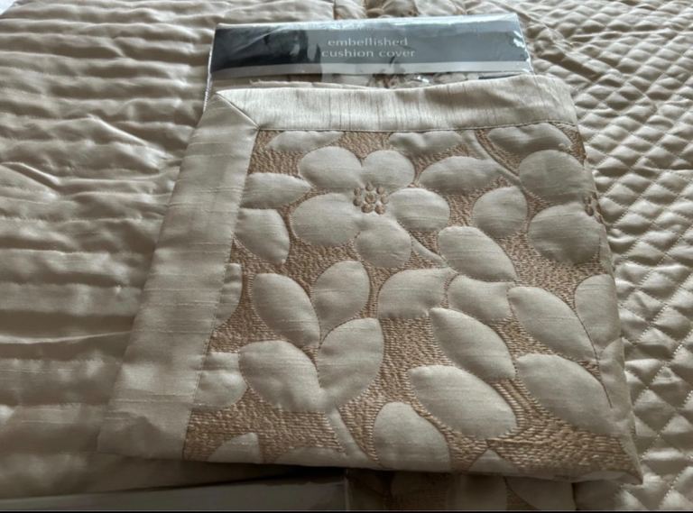 Bundle contains bebspread, 3 housewife pillow cases, 5 pillows shams and 2 cushion covers (1 not packaged). Comes from smoke and pet free home. The bedspread packing got damaged when I put it back in. Any reasonable offer will be considered.