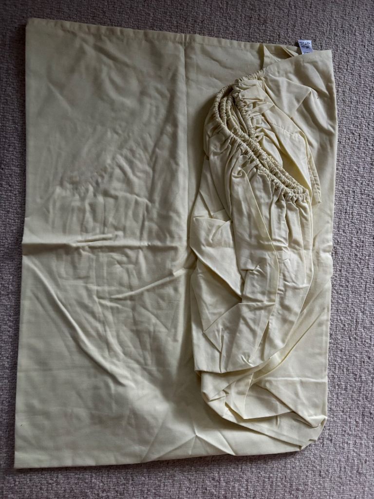 One single valance, one single plain yellow fitted sheet one single duvet cover, three Oxford pillowcases and one cushion cover