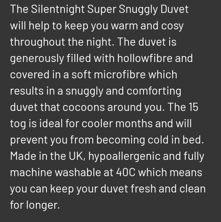 Silentnight super snuggly 15tog double duvet.Hardly Used. Too warm for me. Comes from smoke and pet free home