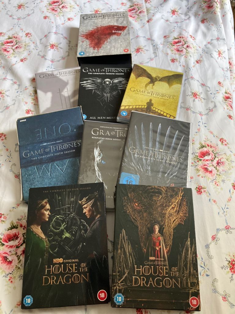 The complete set Seasons 1 - 8 Game of Thrones plus season 1 and 2 of the House of the Dragon Original and in very good condition. That’s 50 dvd discs in all .