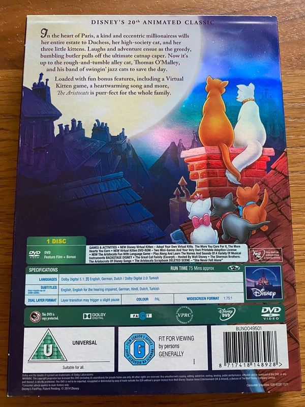 Disney classic that took four years to make. When an eccentric millionairess decides to leaves her money to her cat, Duchess (voiced by Eva Gabor), sneaky butler Edgar decides to dispose of the furry obstacle and claim the loot for himself. The embattled Duchess is helped out by streetwise alley cat Thomas O'Malley (Phil Harris) and his scat cat friends - a group of feline jazz musicians.