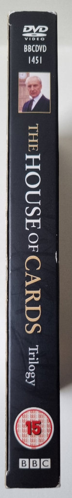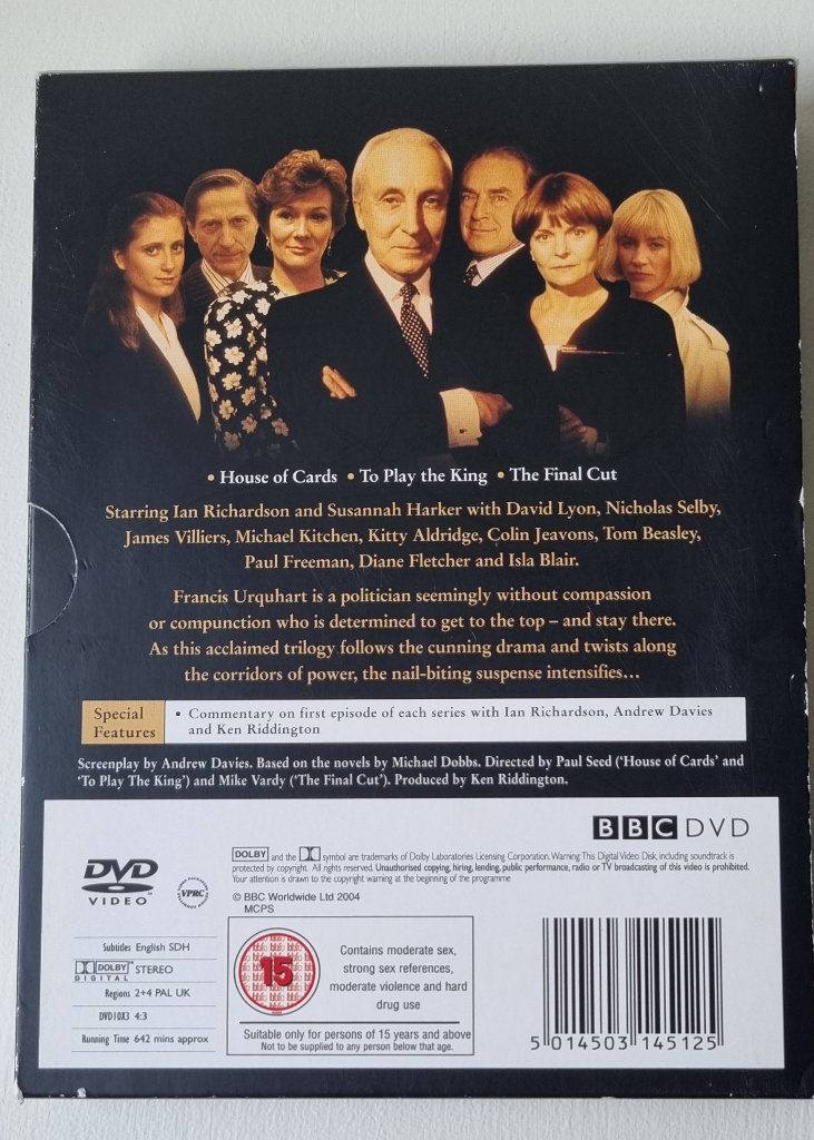 The House of Cards trilogy box set of DVDs – House of Cards, To Play the King and The Final Cut. The DVDs have never been played and so are in excellent condition. There is slight damage to the edges of the outer card sleeve