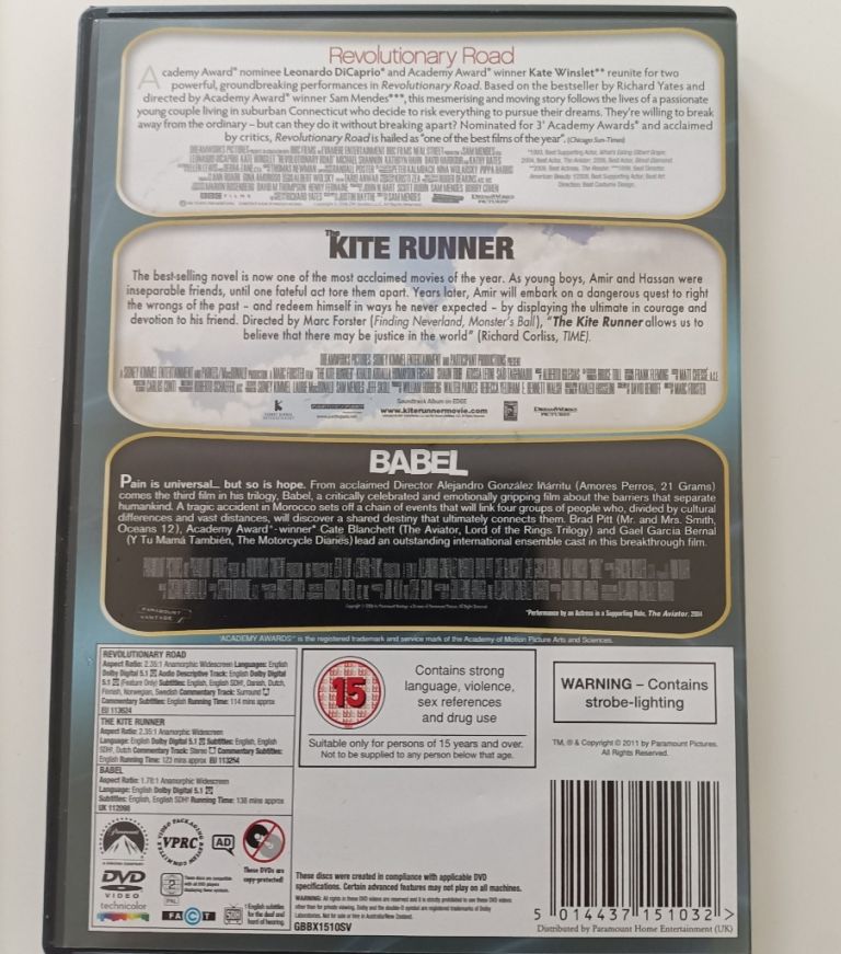 Revolutionary Road (Leonardo DiCaprico and Kate Winslet), The Kite runner and Babel (Brad Pitt and Cate Blanchett). All in very good condition.