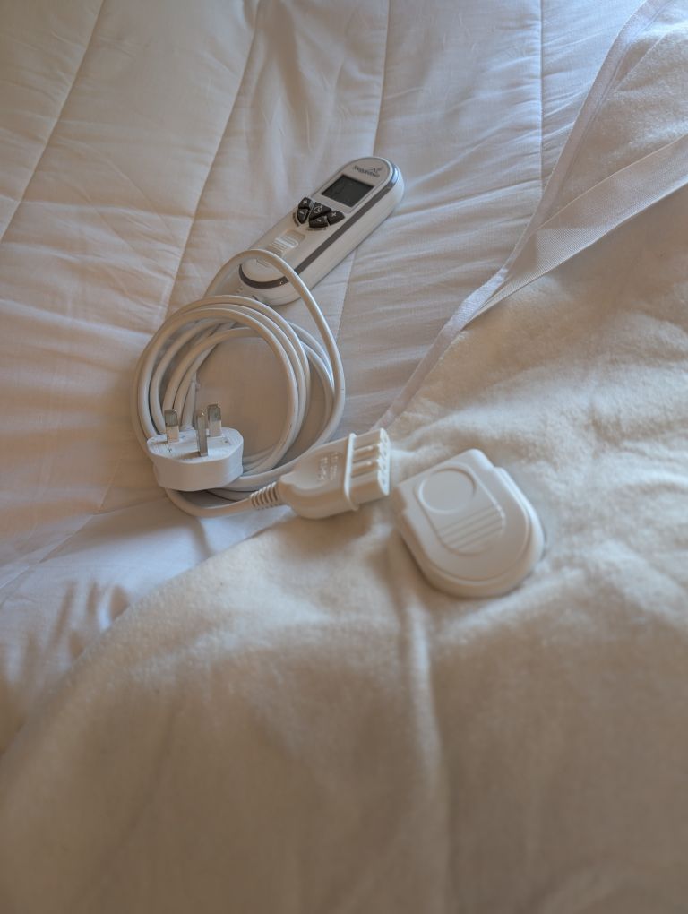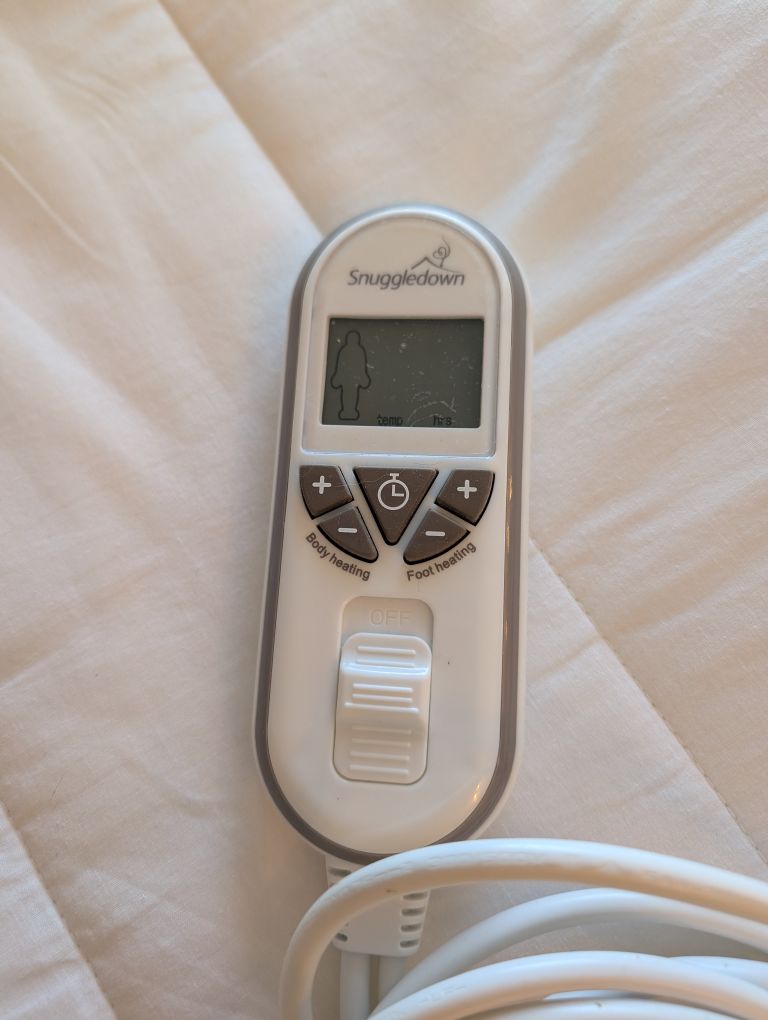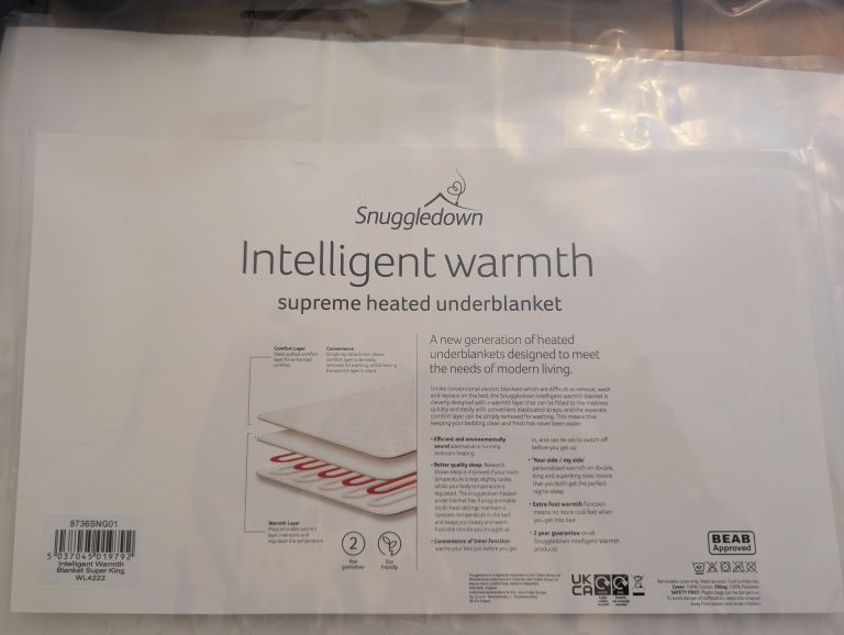 The Snuggledown Superking Dual Control Heated Underblanket Electric Blanket is a luxurious and practical addition to any bedroom. Made from 100% polyester, this rectangular blanket in super king size offers all-season insulation with its 9 heat settings. The corded electric design allows for easy control and the white colour adds a touch of elegance to the room. Machine washable and weighing, this heated blanket from the trusted brand Snuggledown provides a cosy and comfortable sleep experience. can be controlled from either side of the bed. So both sides can be heated separately. Well looked after and freshly laundered.