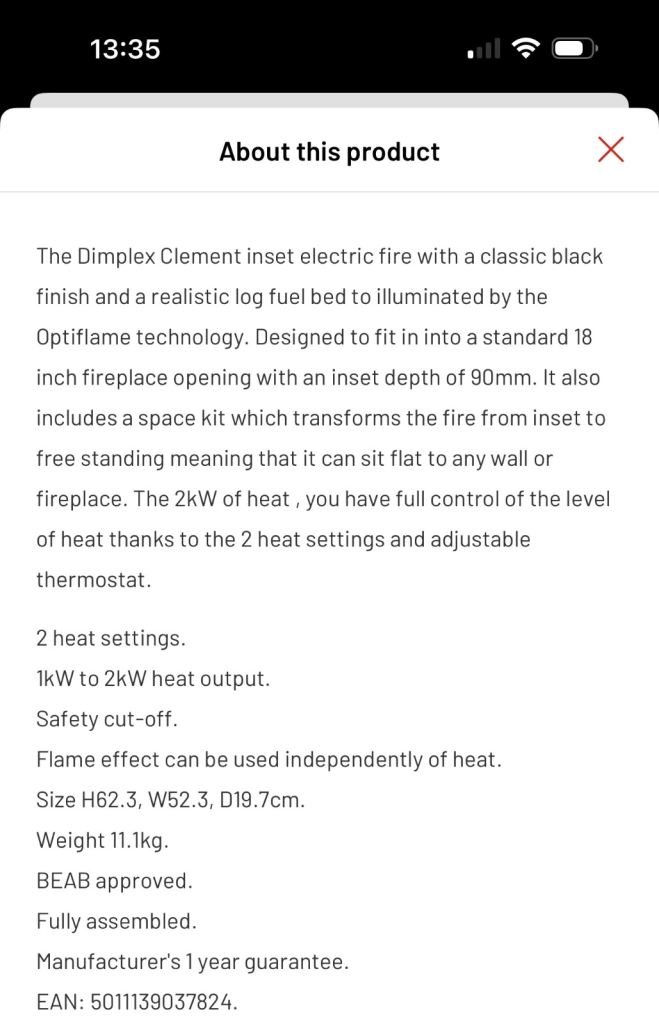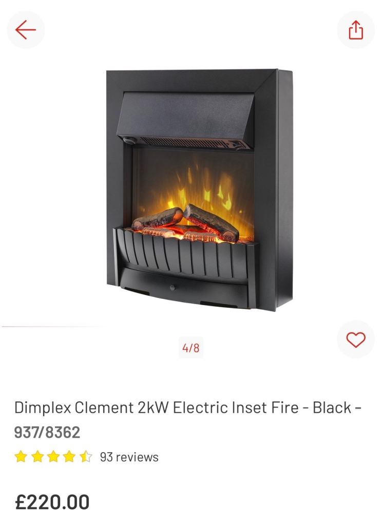 Electric fire, beautiful condition like new as hardly used. Bought and changed mind on having fireplace. Still current and on sale at Argos where I bought it.