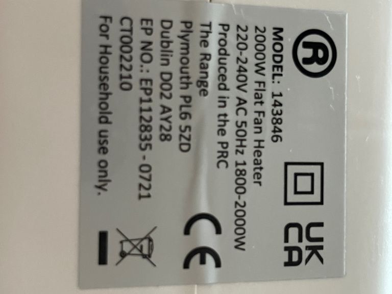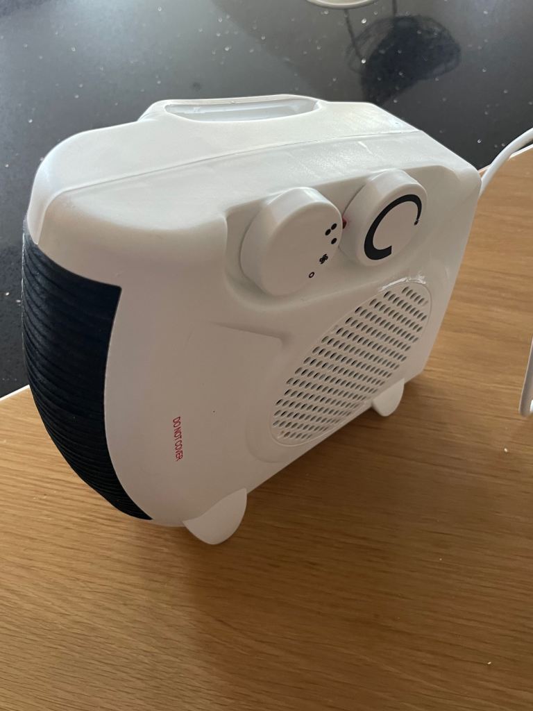 2000W electric fan heater with temperature adjustable control, good condition from a non smoking house. Great to take the chill off when central heating isn’t required.