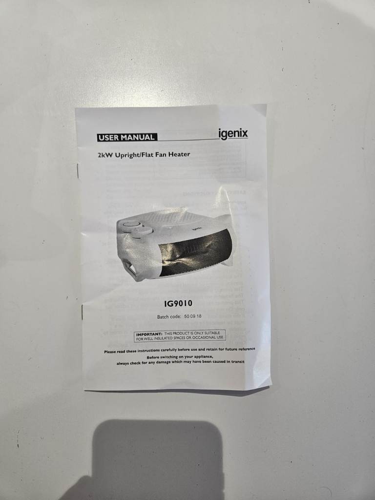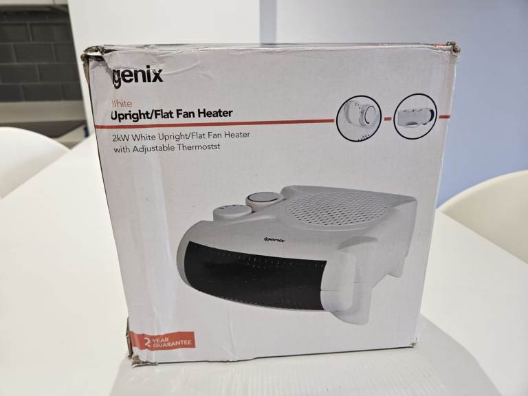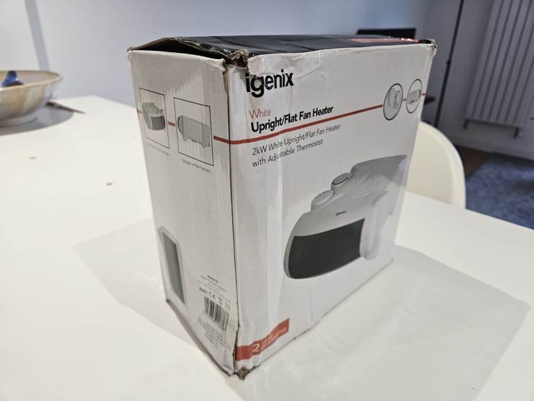 Igenix electric fan heater in white, in excellent condition. Compact and easy to move around, ideal for quickly warming a bedroom, home office, garage, or small living space.