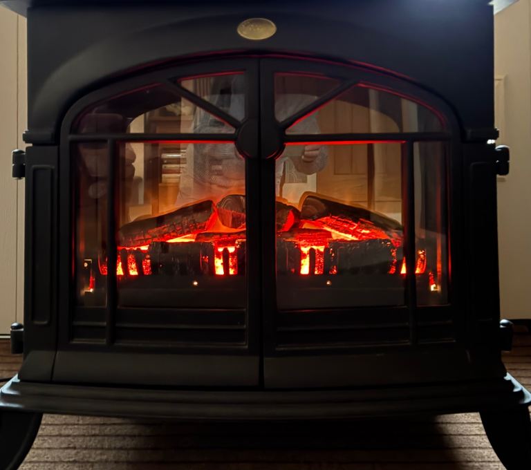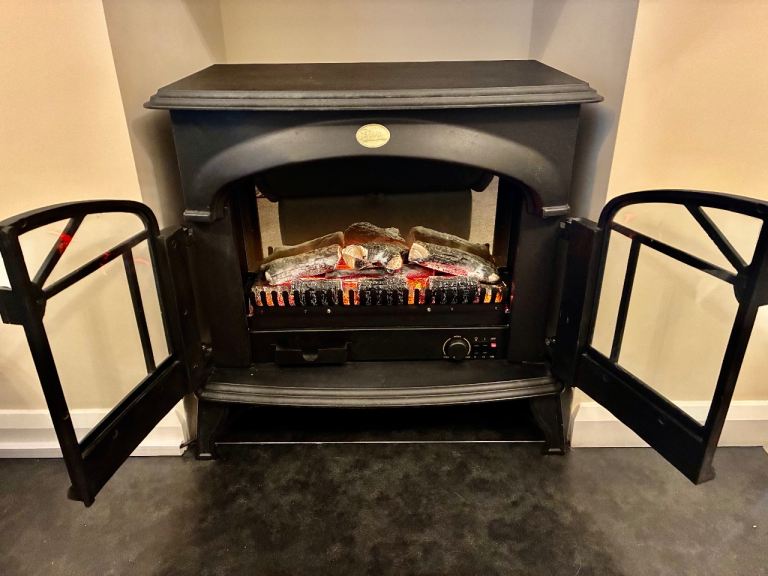 Black freestanding electric fire with flame burning log effect. The manual or remote controlled allows the fire or flame effect be used independently. Heat provided by a powerful concealed 2kW fan heater can give instant