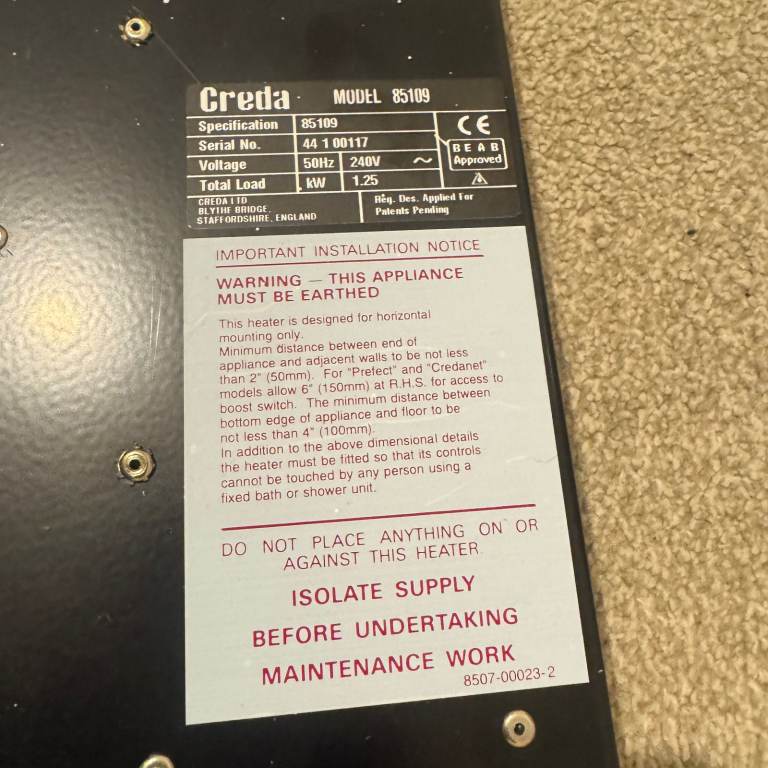 LONG WALL PANEL HEATER BY CREDA MODEL 85109 – THE PANEL HEATER IS IN WORKING CONDTION, I HAVE REMOVED IT AND UPGRADED MY PANEL HEATER. THIS WOULD SUIT ANYONE THAT IS LOOKING TO HEAT A ROOM UP DURING THE WINTER MONTHS.