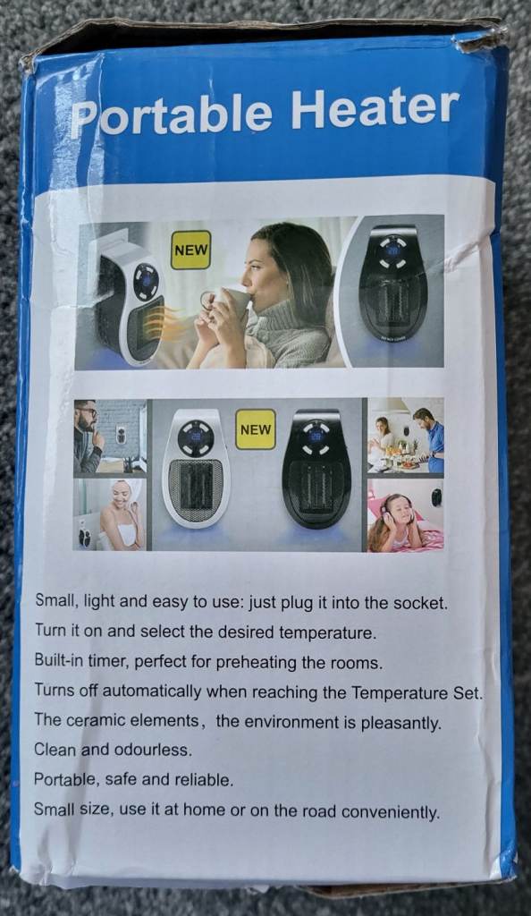 Portable plug in 500w heater, ideal for small rooms, caravans and mobile homes. 2 fan speeds, timer function and auto power off.