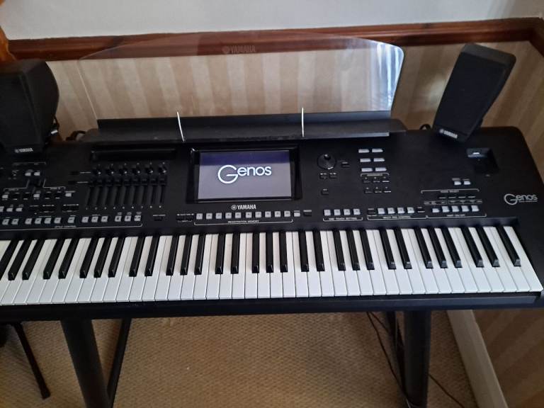 YAMAHA GENOS 76 Key, Arranger Workstation Keyboard, with Stand & GNS-MS01 Speaker SystemVolume & Expression pedals & 1000's of styles, midisExcellent condition. Only used at homeIdeal for live performance or recording purposesHUGE range of Voices, Styles & ArpeggiosOver 1710 extremely high-quality instrument sounds550 backing styles Genres from rock & pop to jazz dance & EDM Big Band Latin & orchestral + loads more216 arpeggios for complex guitar riffs otherwise difficult to play on a keyboard + patterns for other instrument stylesPowerful Effects EngineGENOS superb voices - plus enhanced onboard effectsVCM technology using Yamaha’s professional mixing consoles.100'S of effects; Reverb, delays, wah, phasers, amp simulators, chorus & modulation effects, compressors & rotary speaker simulationsVocal Harmony Processor -With Synth Vocoder Effects can be added to 'your voice'On-board 1.8GB flash memory to install further soundsExpansion Manager Software for MAC/PC to create your own sounds samples & loopsHigh resolution 9” TOUCH DISPLAYAssignable Sliders, Buttons & Knobs, to simplify live performances.Registration Memory - Recall Favourite SettingsSave Banks of 10 buttons to internal memory to give 1000'S of your setups at your fingertips, without external memory sticks etc.,Record Music Using Onboard StudioGenos Recording studio can record 16 tracks of MIDI music or a stereo WAV fileMIDI recorder is fully featured multitrack sequencer with event editing & both realtime & step recording modes.S/PDIF Digital outputConnect GENOS to compatible equipment using digital output, without loss of audio signal quality.MULTI PADS2Gbit Digital Audio Converter (DAC)Width 1234 / Depth 456 / Height 138 / Weight 13 KgFull system ONLY - No swaps or P/EXCASH or Bank Transfer on COLLECTION, in person, ONLYNo delivery or CouriersNO DEALERS THANK YOU
