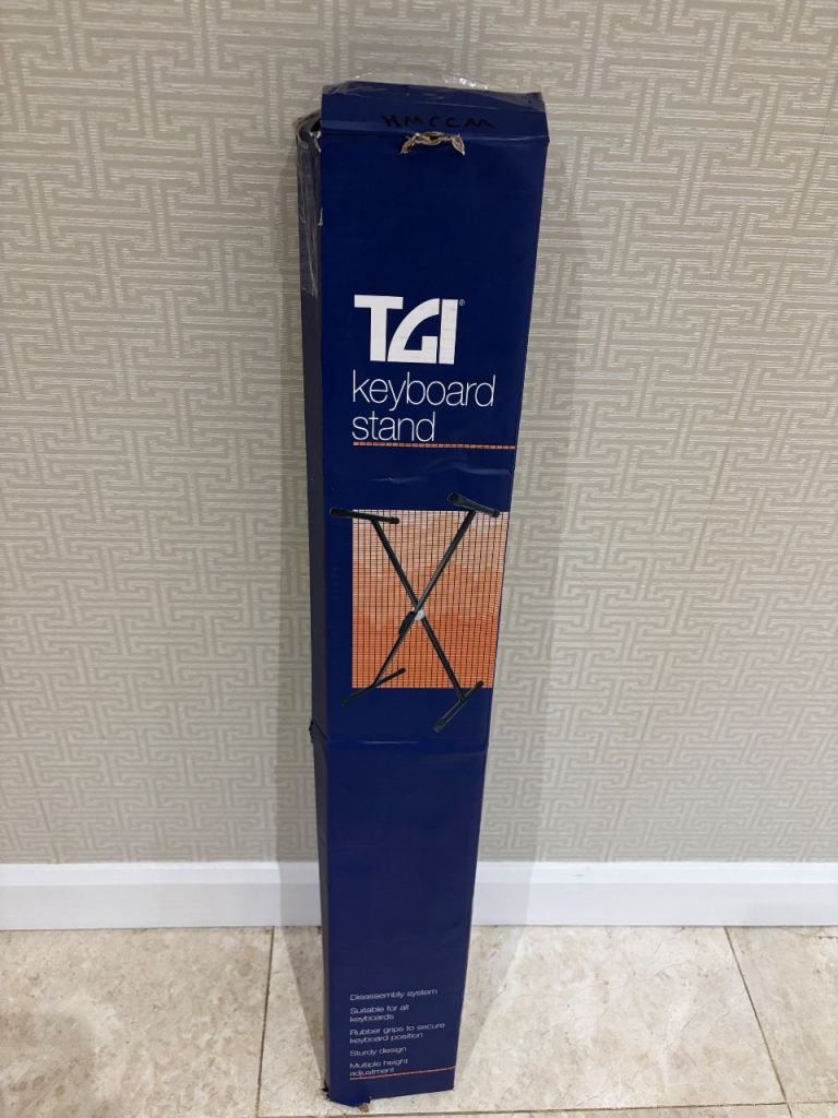 Power adapter, music rest, brand new stand, original box and manual included.