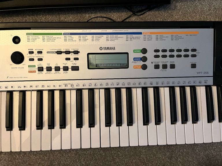 The Yamaha YPT-255 is a 61-key portable keyboard designed for beginners, featuring 385 instrument voices, 100 styles, built-in effects, and the Yamaha Education Suite (Y.E.S.) with a 9-step lesson function to help learn songs. Its portability allows for battery operation, and an AUX IN jack lets users play along to music from their MP3 players, making it versatile for practice and fun.