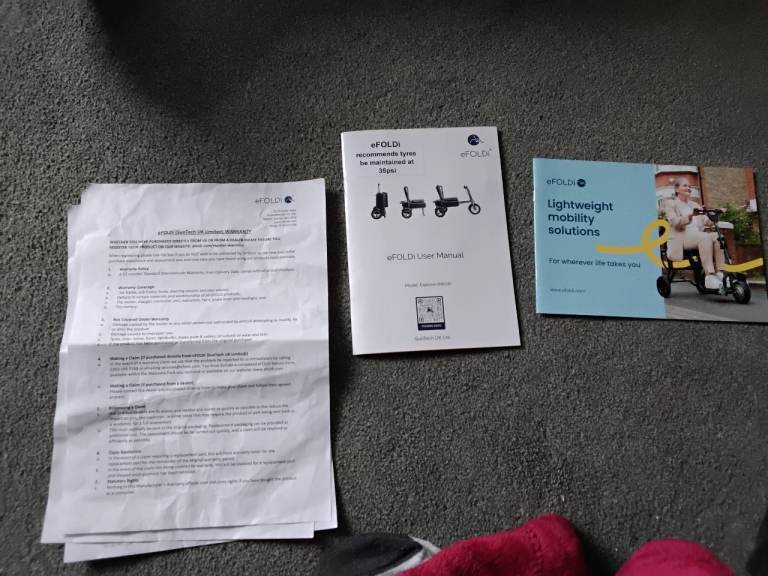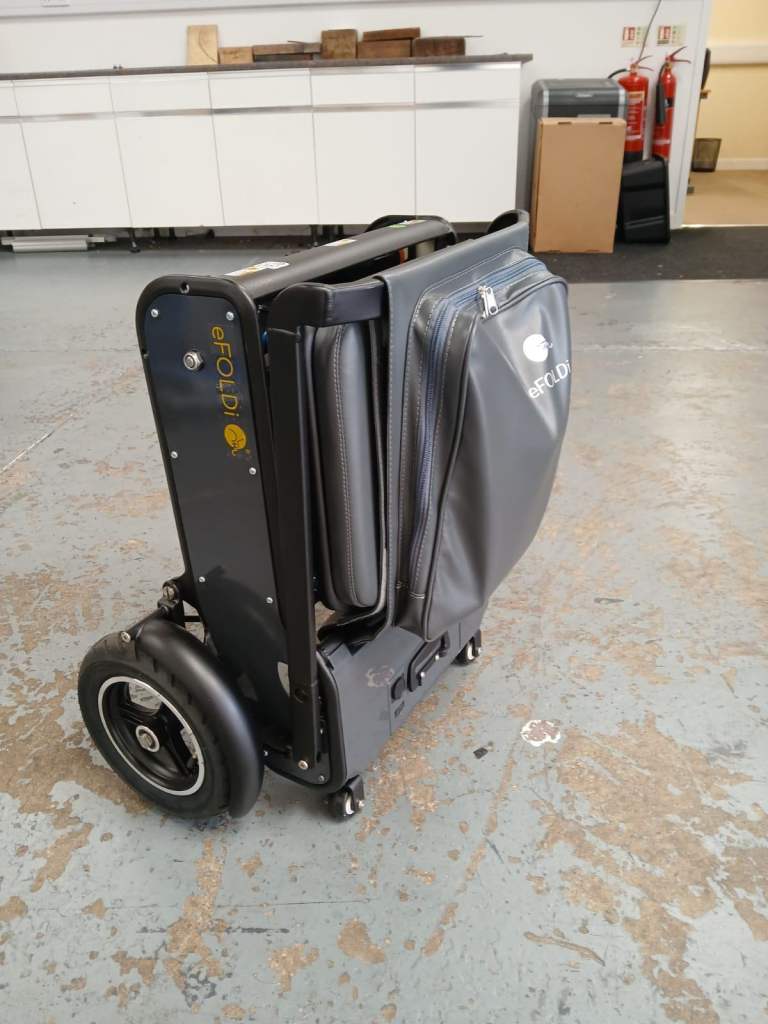 Efoldi explorer mobility scooter new brought it in November and only used once, it folds down for travelling, it comes with a cushion, foot peg extenders, one brand new front tyre and a inner tube. It weights 19kg.