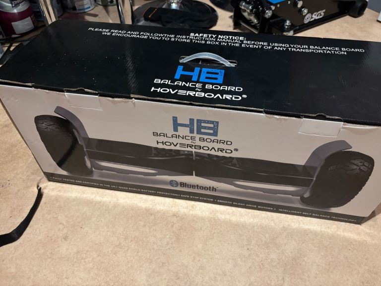 Generally good condition, slight wear on the platform but no damage and all full working. Hoverboard has Bluetooth connection to play music through built in speakers. And LED lights front and back. Comes complete with original box and charger.