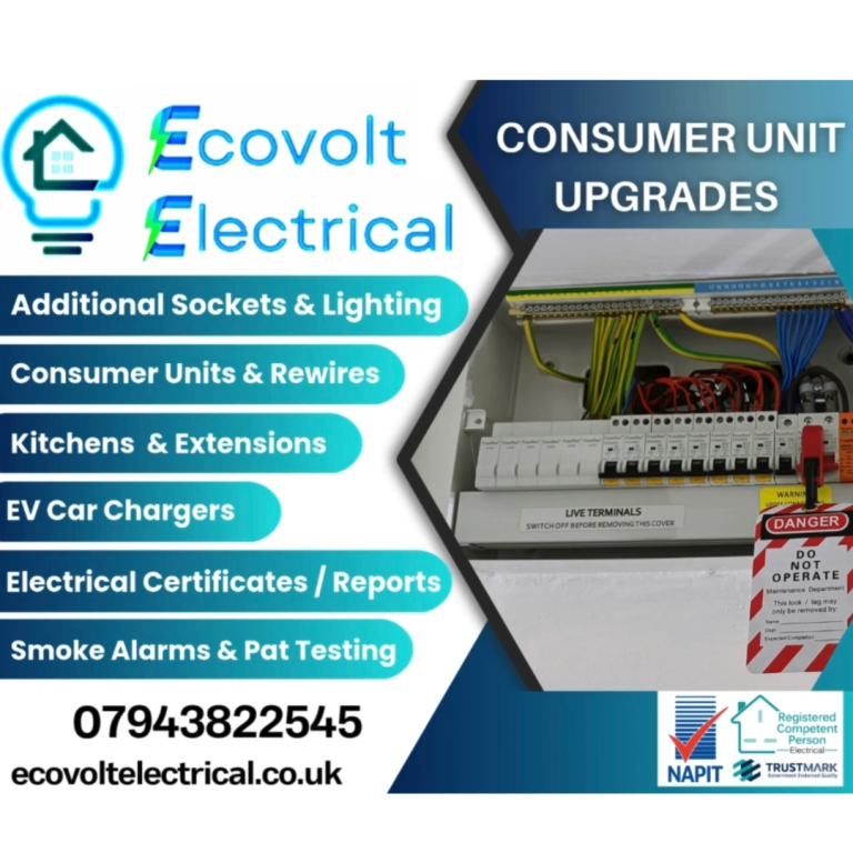 At Ecovolt Electrical we are qualified, fully insured electricians approved with NAPIT allowing us to carry out and sign off notifiable works (certificate Eic,Eicr etc) we are also members of Trust Mark a government endorsed scheme for reputable tradesmen.