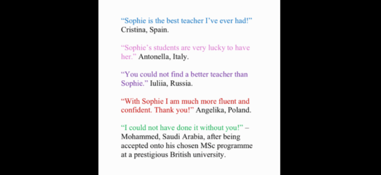 Hello! My name is Sophie. I’m a friendly and highly experienced ESL teacher who has been teaching adults in Exeter and abroad since 2009.