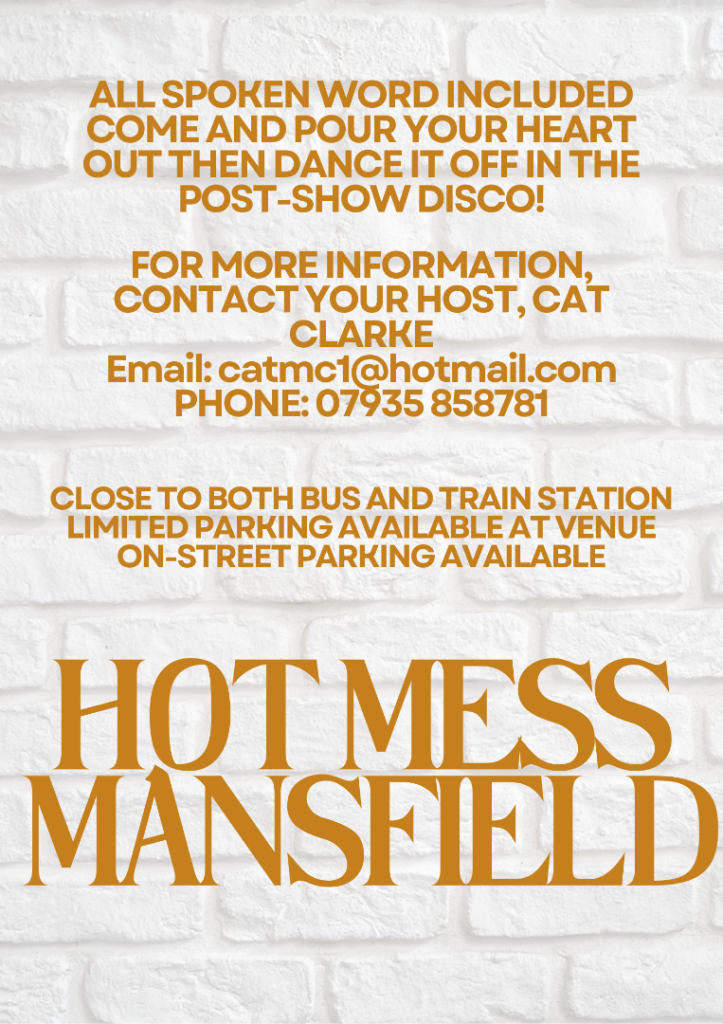 "Hot Mess Mansfield" is a new open mic poetry/spoken word night that takes place on the last Monday of every month at Ye Olde Ramme, Church Street, Mansfield, Nottinghamshire. Either message your host, Cat Clarke (that's me!), to book one of the 5 minute slots or turn up early to get your name down on the list. Or just come along to watch and listen! As it says in the flyer: pour your heart out then dance it off in the post-show disco!