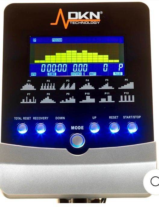 Clear blue LCD display showing time, speed, distance, calories, RPM, watts, pulse & recovery
