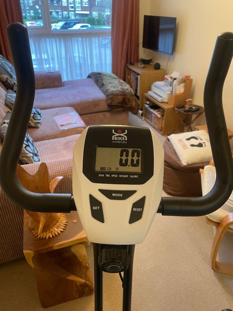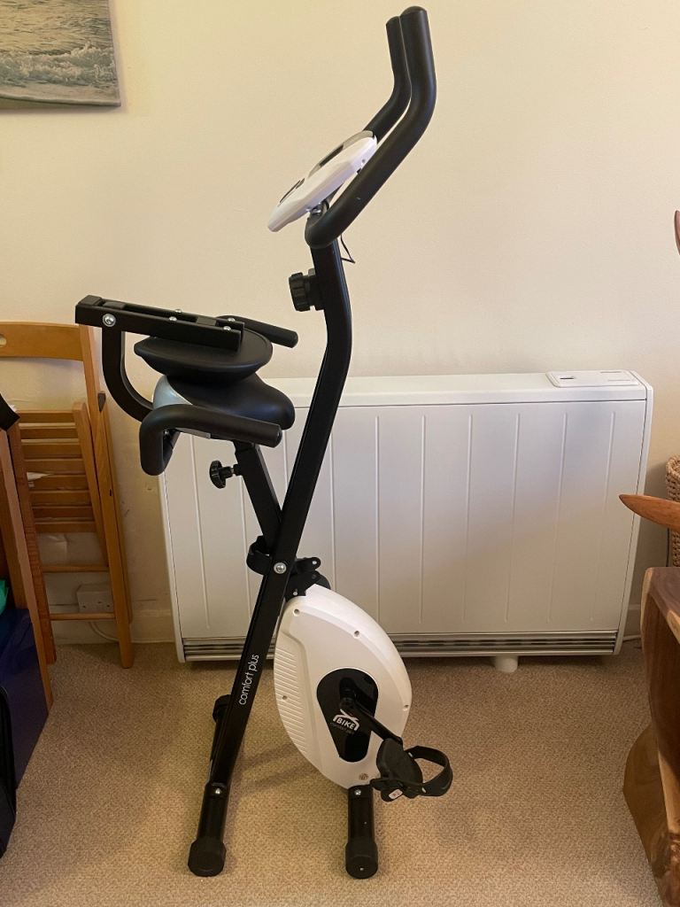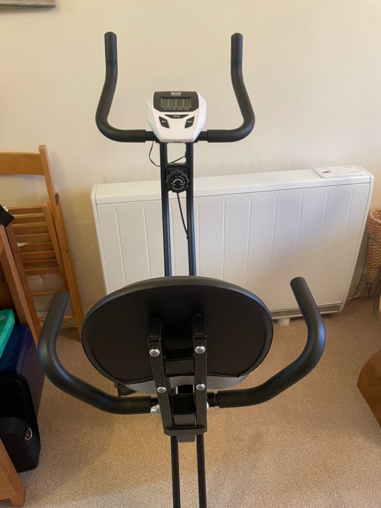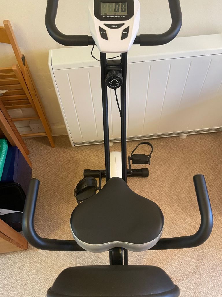 Used but in good working condition. Foldable. Comfy padded seat and backrest. Working display for Time/Speed/Distance/Calories. Adjustable tension control. Wheels under front bar to assist is moving.
