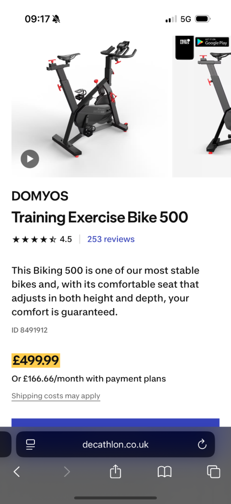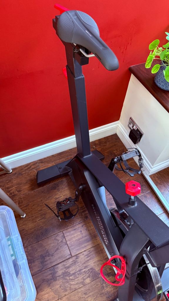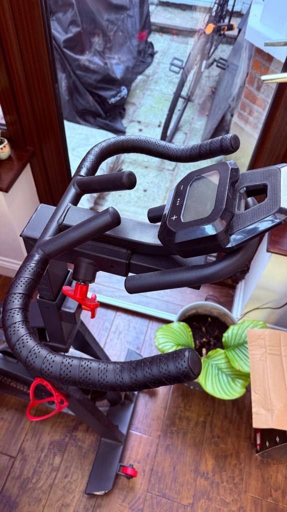 Domyos 500 from decathalon. Bought for £500. Fantastic bike you can set phone or iPad on the front for classes or watch programmes. Unfortunately it’s not getting the use by owner who only used twice, so selling for £350 in nearly brand new condition. Was Used with a saddle cover also so seat is spotless.