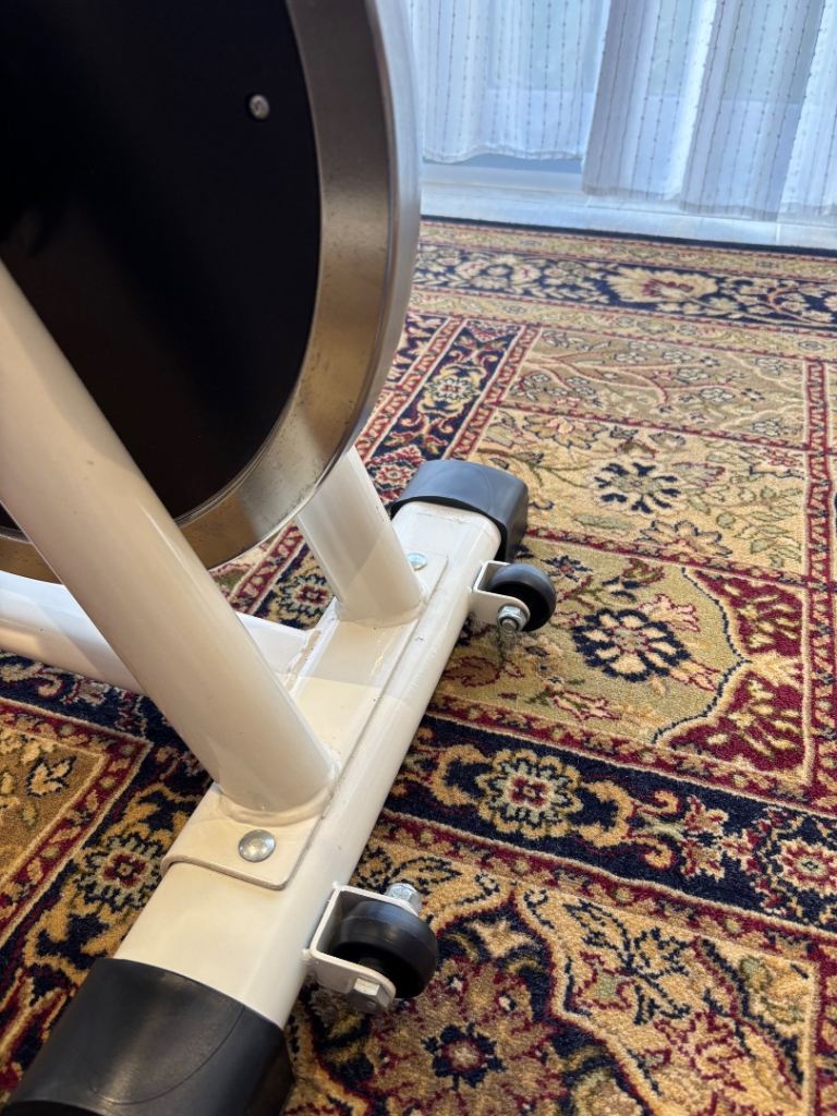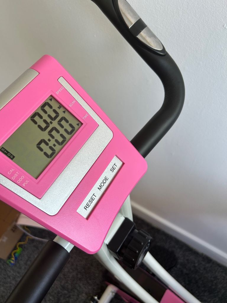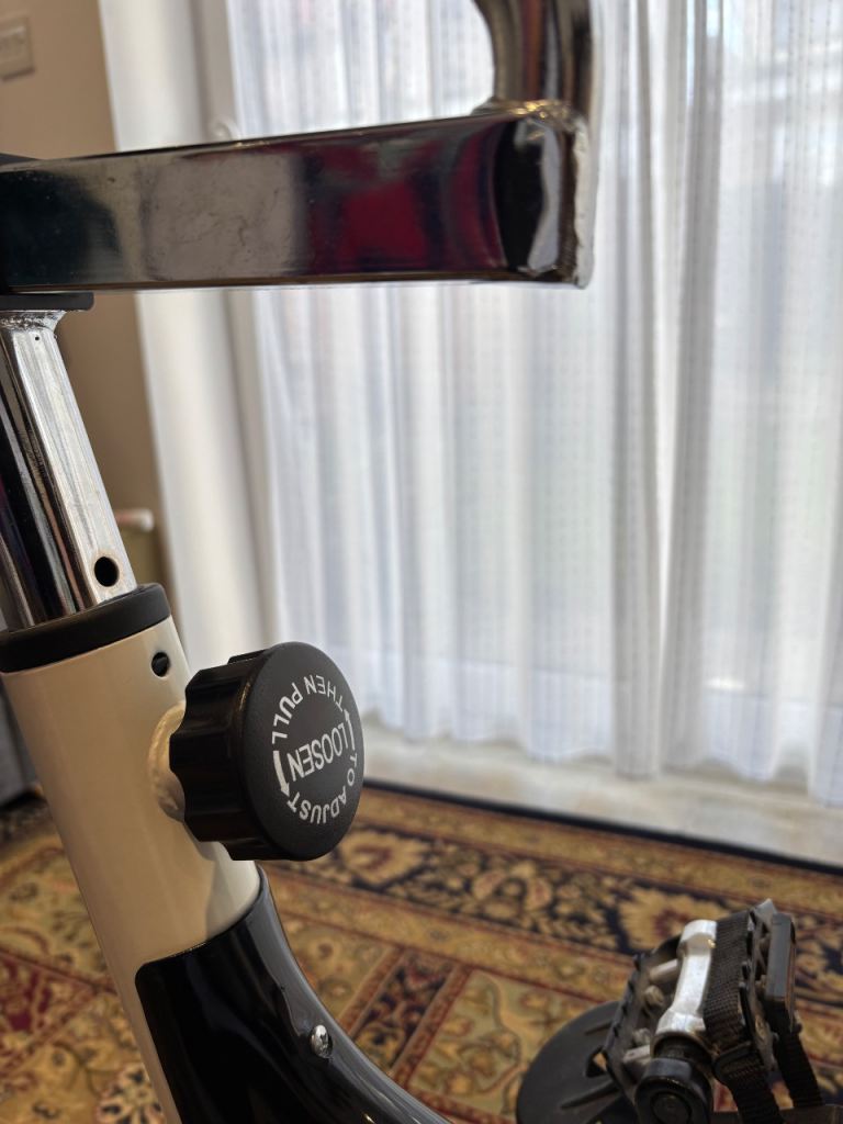 Adjustable seat and handlebars to suit various user heights and preferences. Also has wheels at front for easy moving, and foot inserts with strap for comfortable cycling.