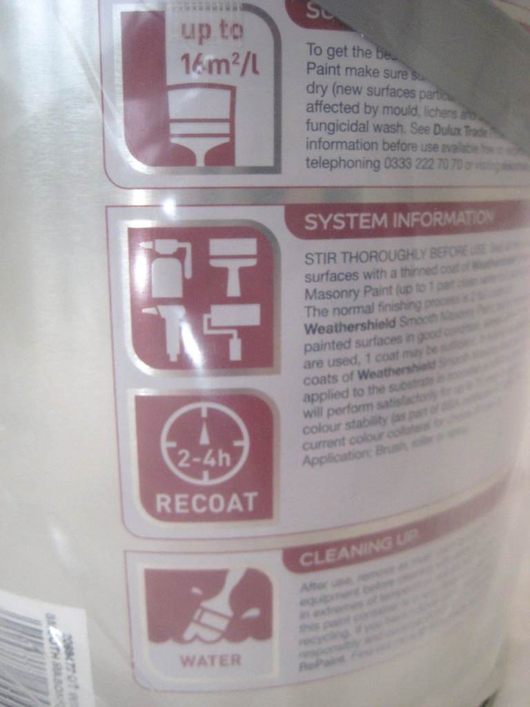 Exterior quality Masonry Paint with Dulux weathershield technology. Easy water based cleaning of equipment.