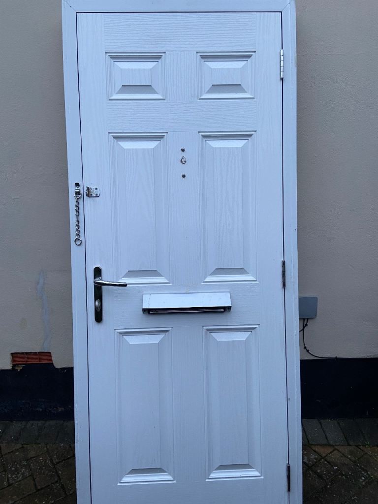 Blue composite front door ,outer frame size 885x2065mm. Full working order ,supplied with key .outer frame has previous install marks .Door slab is in fair condition .