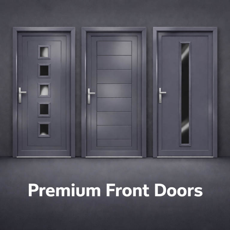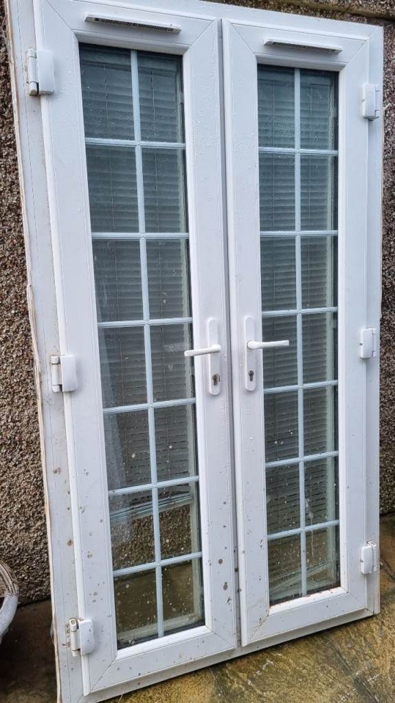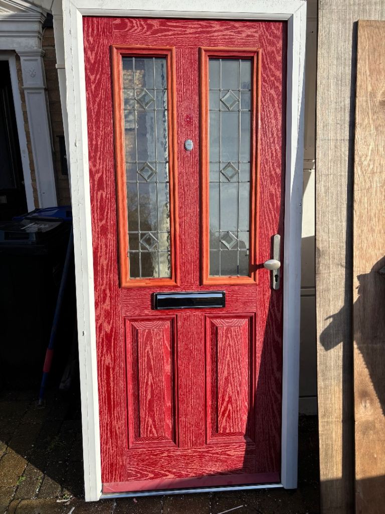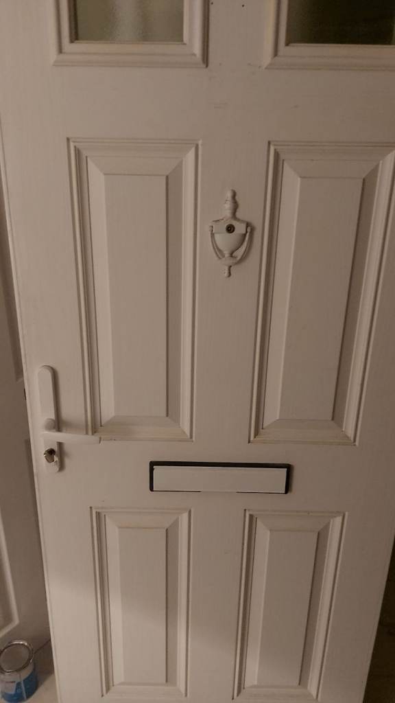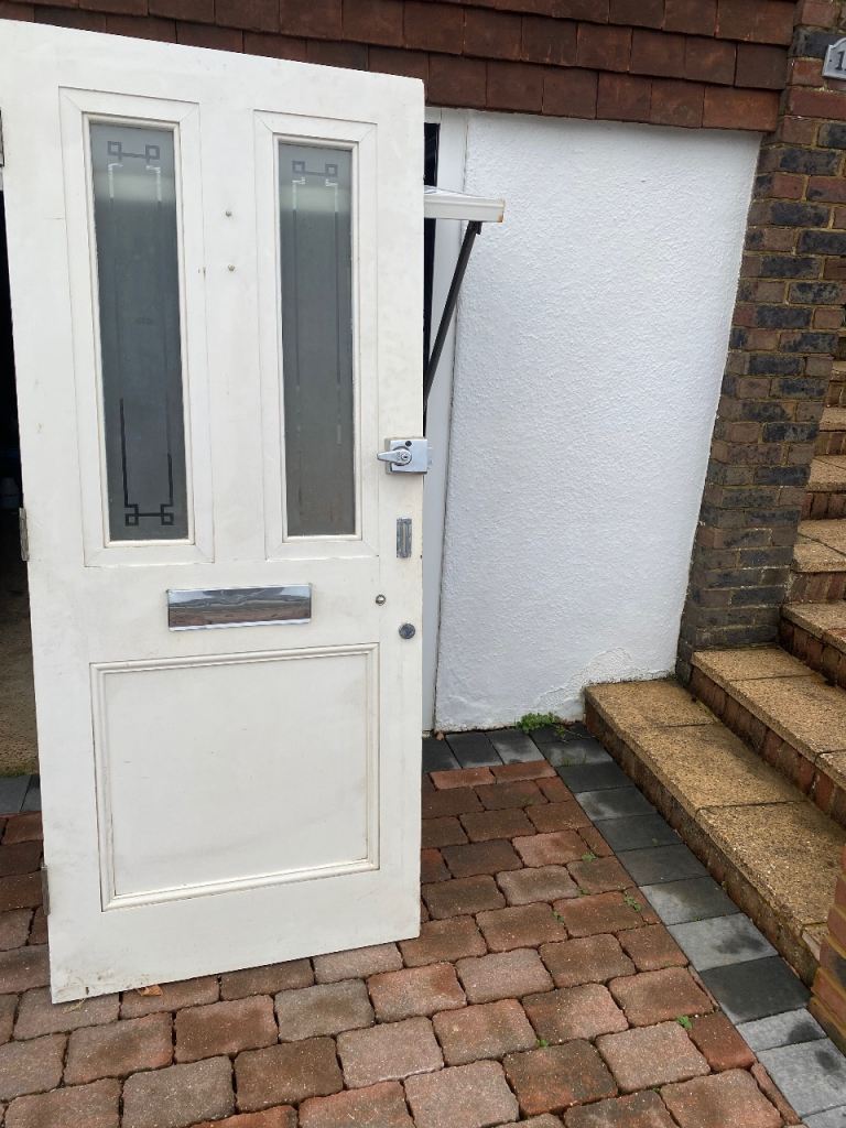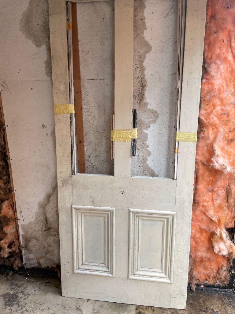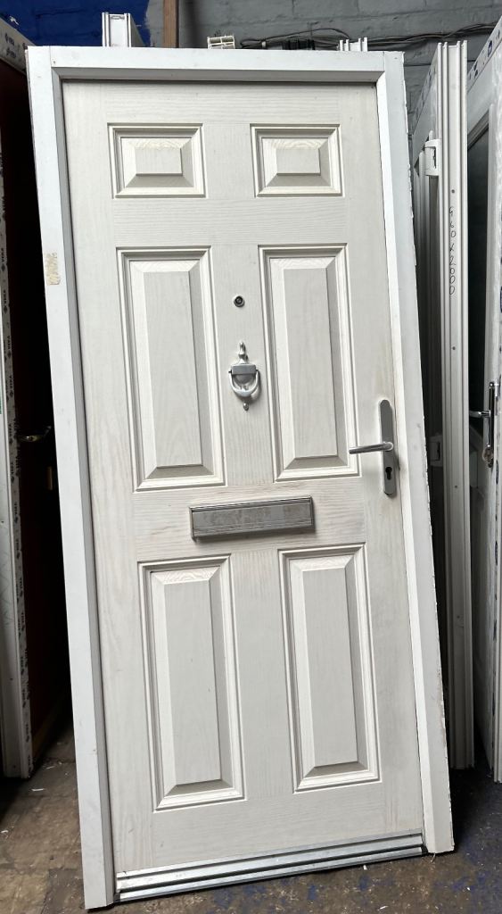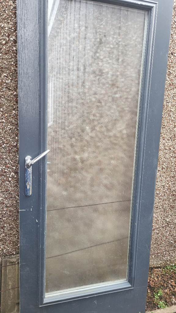 This is a solid - heavy- front wooden door. Painted white on inside and light grey outside.