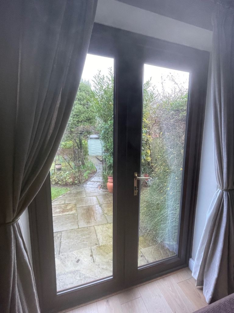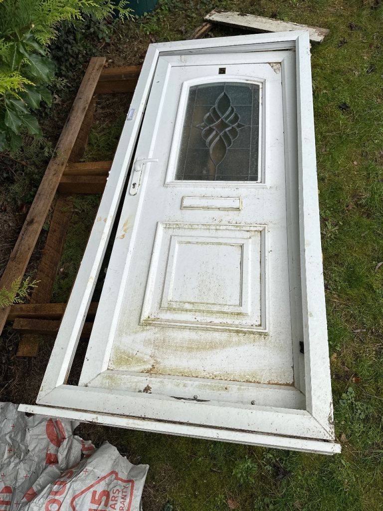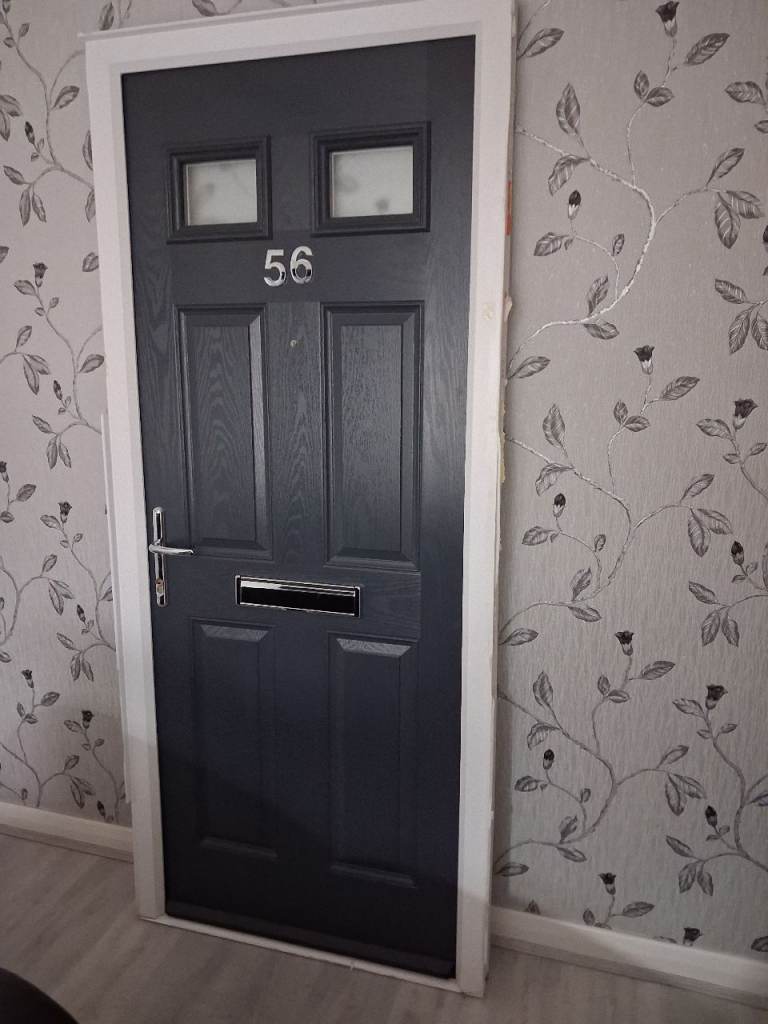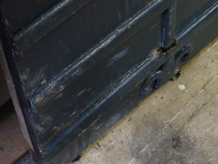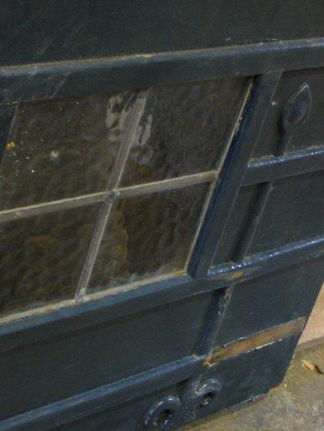 It has the original door furniture (letter box, external metal hinges top and bottom and a central four pane leaded light window) above the letter box.
