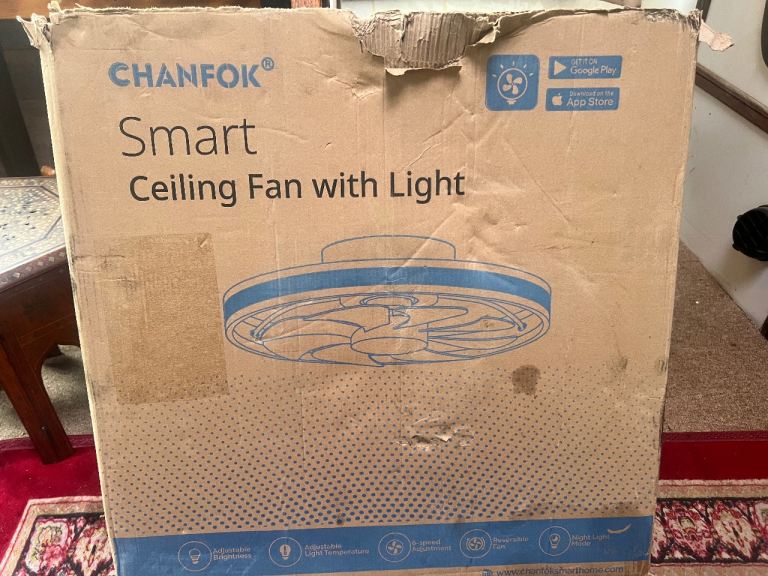 Brand new low profile ceiling fan, never used. It has remote control/ app, 3 light colours, 6 speeds and reversible rotation.
