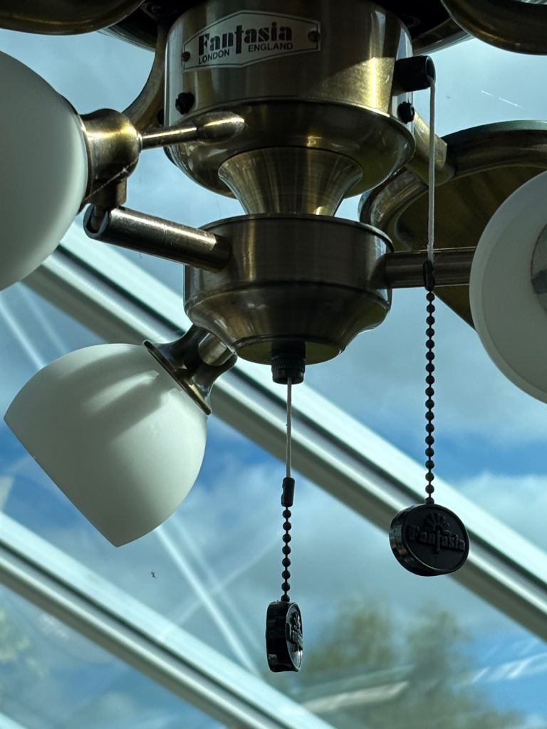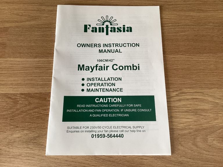 106CM/42 inch 3 speed , 230V, Polished Brass, 3 spotlights with Remote Control & light dimmer. Full installation manual.