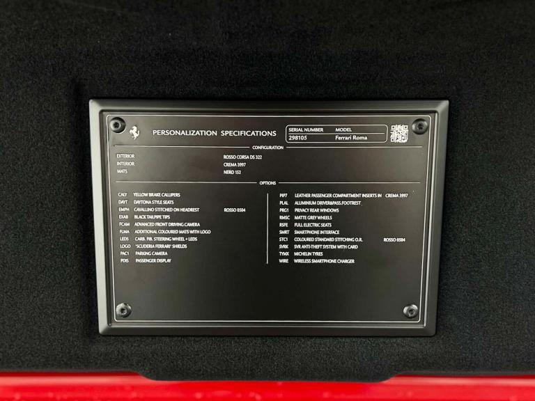 Introducing the stunning Ferrari Roma, a true masterpiece of Italian engineering and design. With only 2,576 miles on the clock, this Italian beauty is ready to hit the road in style. This vehicle benefits from a recent service at Ferrari Sevenoaks and a Ferrari Service plan until 2030. The Ferrari Manufactures warranty is valid until 7th September 2027. Finished in the iconic Rosso Corsa exterior, this Ferrari Roma comes loaded with extras that will take your driving experience to the next level. From the luxurious Daytona Style Seats in Crema leather to the Black Ceramic Exhaust Pipes and Giallo Modena Brake Callipers, every detail has been carefully crafted for perfection.Equipped with advanced features such as the Front Driving Camera, Rear Parking Camera, and Passenger Display, this Ferrari Roma ensures a seamless and safe driving experience. The Carbon Fibre Steering Wheel with LEDs adds a touch of sportiness, while the Wireless Smartphone Charger keeps you connected on the go.Finance from 8.9% APR Representative and Nationwide Delivery available. All of our vehicles are Supplied with a minimum 1/4 a tank of fuel, a 7 Day Money Back Guarantee*, a Full Multi-Point Mechanical inspection, a 6 Month Warranty, a Professional Valet and all vehicles come HPI clear so you can Buy with Confidence.*Every effort has been made to ensure the accuracy of the information above, however, errors may occur. Please do not rely entirely on this information and check with your sales executive about items that may affect your decision to purchase. *Our 7 day money back guarantee is available on selected retail vehicles, please confirm with your sales advisor. *A £299 Admin fee applies to third party external finance companies being used. All vehicle video tours are available upon request. Appointment basis.