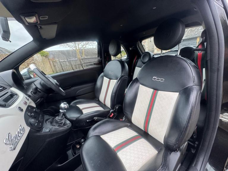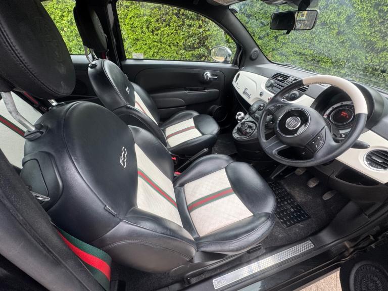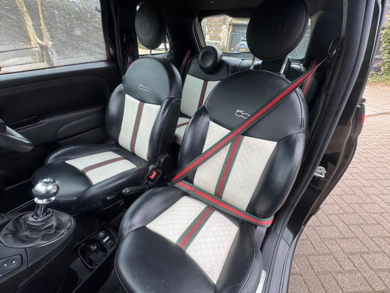 2012 Fiat 500 1.2 ByGucci Edition (1 of 500 made) Year long Mot. FREE 2nd year Mot when due. 3 months warranty., Just 65k miles from new. Very rare car being the byGucci edition (1 of 500 made) which stands out from the rest, Featuring Gucci Styled Seat Belts and two tone leather seats with engraved Gucci logos in addition with the Iconic Green and Red Colouring, Gucci Sill Plates, two tone leather Gucci multifunctional steering wheel, Gucci gear knob and more, Start/Stop technology, Usb point. Aux connectivity, , Bluetooth, voice control, rear head restraints, isofix points more. One of the cheapest cars on the road to maintain, run and insure.. Previous cat s repaired to a high standard in an insurance approved workshop using original parts, was only cosmetic panel damage and have all previous photos upon request, Tax is only £35 a year too and fuel consumption is very good at 55mpg Any inspection or test drives welcome. Ideal first time car