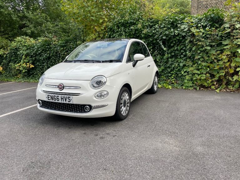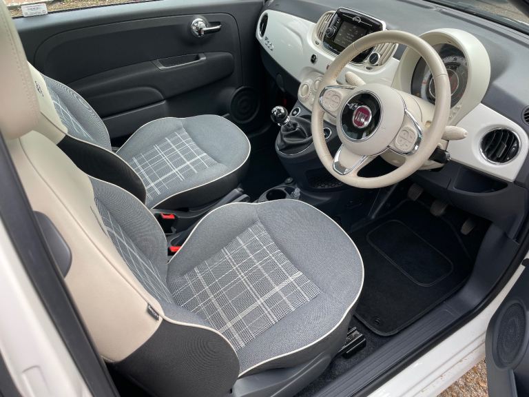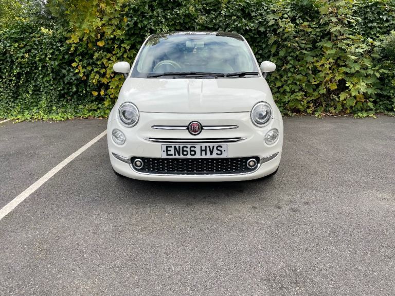 For sale: our beautiful Fiat 500 Lounge, 2017 (66 plate), in white colour with white grey mixed fabric and leather interior. This car has been well cared for and it is in very good condition throughout for its age.