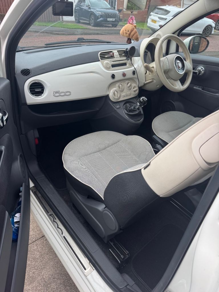 White Fiat 500 Lounge, in great condition with low mileage. Economical, easy to drive, and ideal as a first car. £35 Per yr Tax!