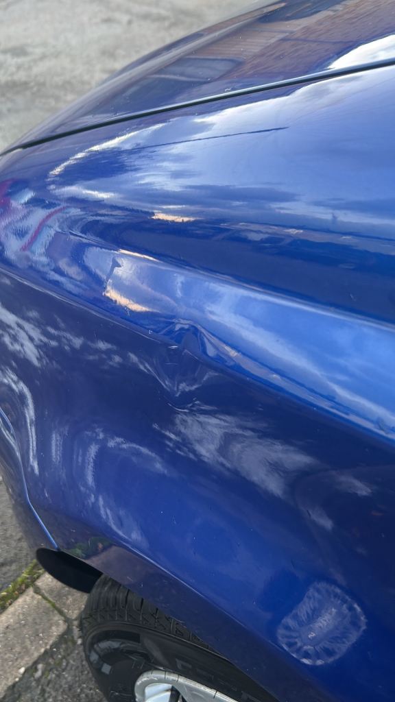 Has a small dent in the left front wing, please see photo.