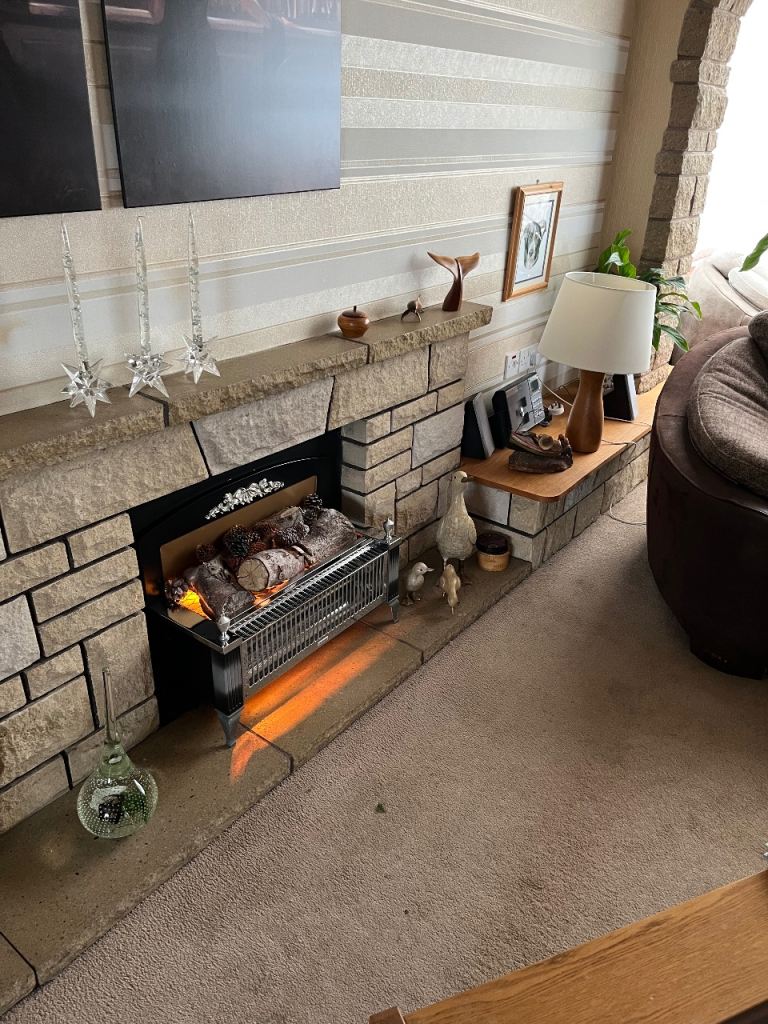 Cotswold stone fireplace complete with fire and surrounding stone