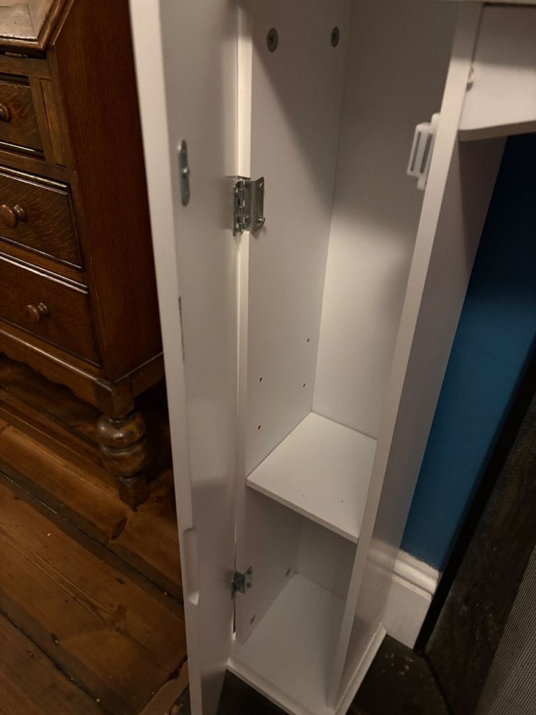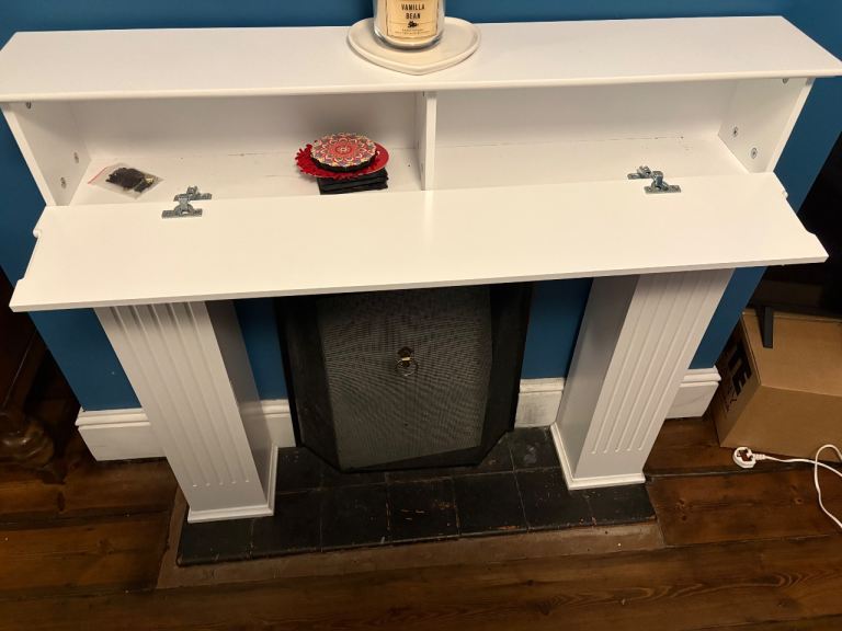 White wooden fireplace surround with storage on each side and on top