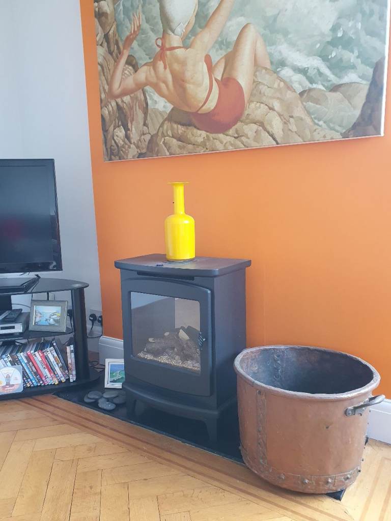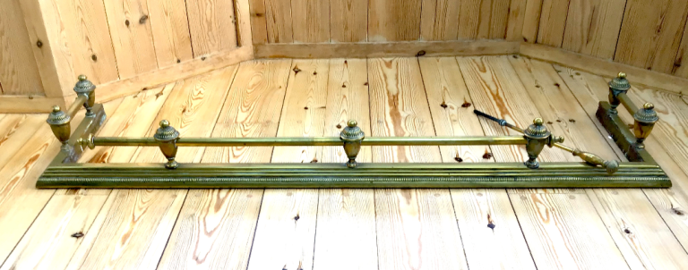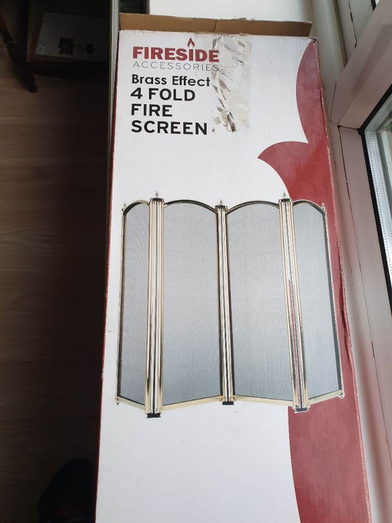 Brass colour 4 fold fire screen. Brand new, in original packing and unused. Has black mesh panels. Is 63.5 cm high and fits a standard size fireplace. All inquiries welcome.