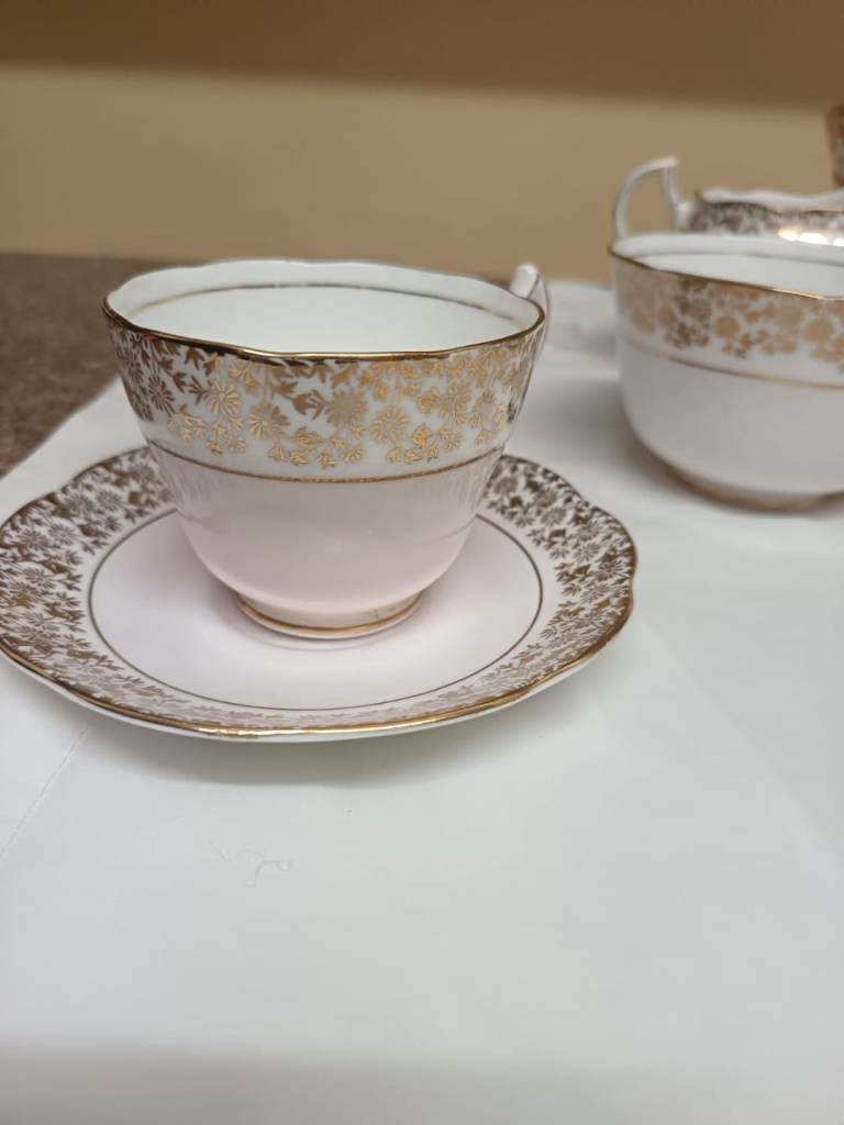Antique China Tea Set. Frentum Royal Crown Pottery Fine Bone China. White with very very pale pink centre and gold leaf design.